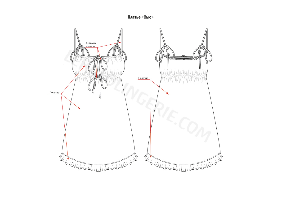 Платье умеренного объёма и свободного силуэта, длиной ниже середины бедра. Лиф отрезной с кулиской на сборке с помощью шнурка из основной ткани. Горловина переда и спинки овальной формы. Юбка на небольшой сборке притачивается к лифу под грудью. Лиф двойной. Платье на лямках из основной ткани. Застёжка — бантик из лямок.